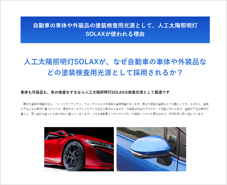 自動車の車体や外装品の塗装検査用光源として、人工太陽照明灯SOLAXが使われる理由