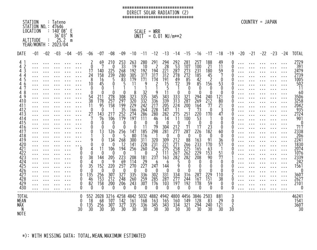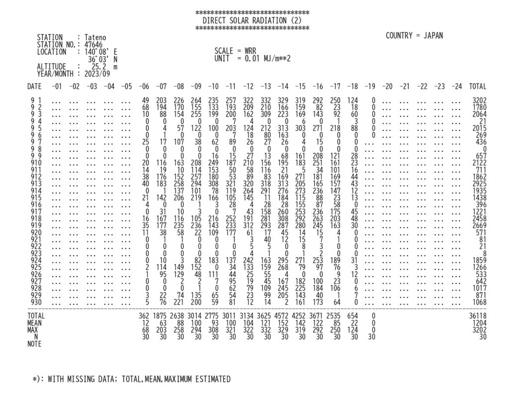 因みに、4月と9月の日射量のデータが気象庁のポータルサイトに出ています。以下は2023年4月と9月のつくば市における日射量のデータになります。