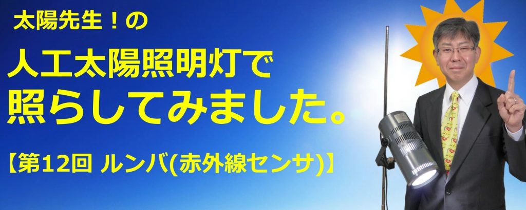 ご覧頂いたルンバの誤動作検証試験の映像は、テーブルの下の白い袖机上面に人工太陽照明灯SOLAX XC-500EFSSの光を照射、段差センサの受光部に直射太陽光と同等の強度の光が当たりその反射を模擬して誤動作を誘発させました。私たちはルンバのメーカーではないので、この誤動作の本当の原因は不明ですが、赤外線の段差センサが正しくセンシングできなかったことによるものと推測します。(注)