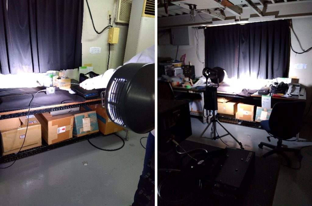 実験方法は、暗い部屋の中でガンダムに向けて、宇宙太陽照明灯(形式:XC-500HFSS)の光を累計18日間、実験期間中は消灯せずに24時間連続で下記条件の光を照射し続けました。