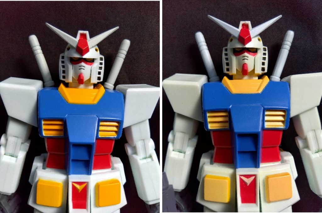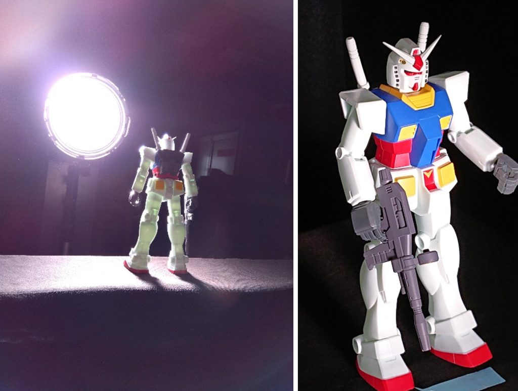 左側が宇宙太陽光を照射していないガンダム、右側が宇宙太陽照明灯を18日間照射したガンダムです。