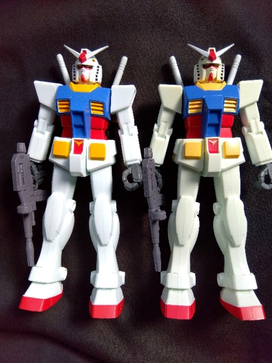 下の写真は、実験終了後に宇宙太陽照明灯を照射したガンダムと照射していないガンダムを並べて撮った写真です。比べてみると、照射していないガンダムに比べ、照射したガンダムは表面の色が変わっていました。