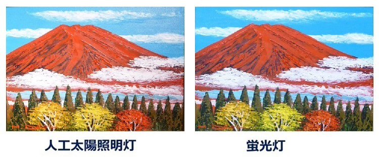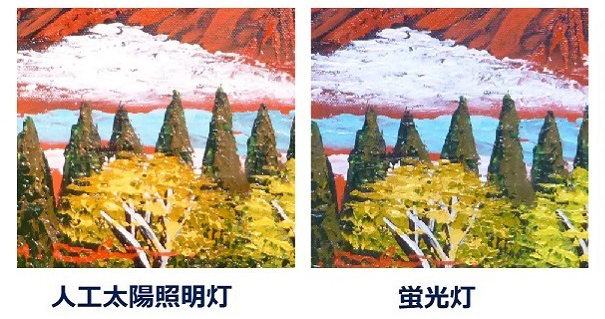 これを人工太陽照明灯で照らしてみると蛍光灯とは違った色で見えます。