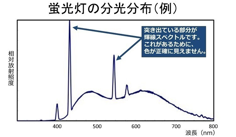蛍光灯など輝線スペクトルのある照明では、その微妙な色の違いが分からずに、