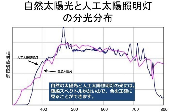 ちなみに、人工太陽照明灯を使って、屋外での見え方を室内で再現すると