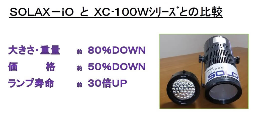 そこで、開発期間2年をかけて、現タイプ(XC-100Wシリーズ)より小型・軽量・低コストを実現した持ち運びのできる人工太陽照明灯「SOLAX-iO」の開発に成功しました。