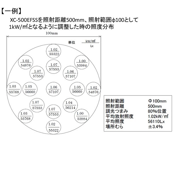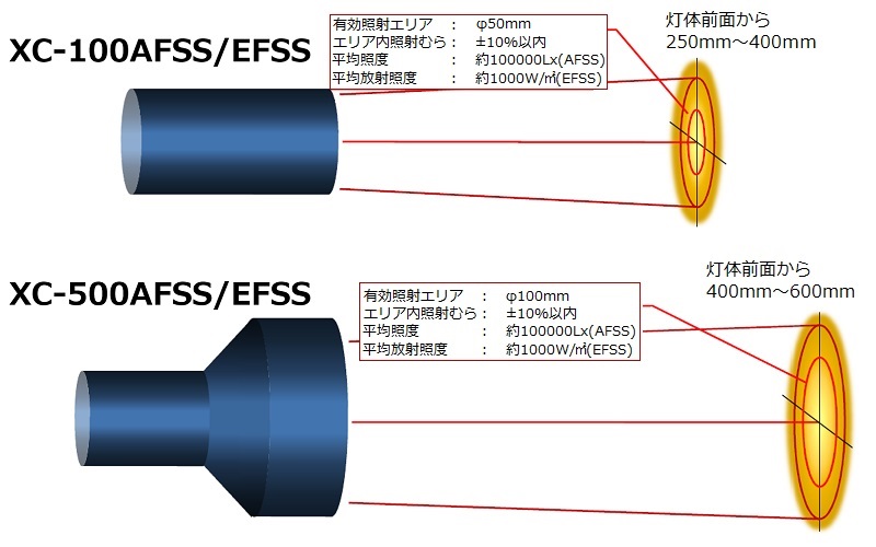 人工太陽照明灯スーパースポットタイプ「形式:XC-100EFSS、XC-500EFSS」なら、真夏の太陽光と同程度の放射照度1000W/m2(この場合の照度は約6万ルクス)、「形式:XC-100AFSS、XC-500AFSS」なら、照度10万ルクスを照射できるタイプなので、真夏の太陽光をいつでも室内に再現することが出来ます。